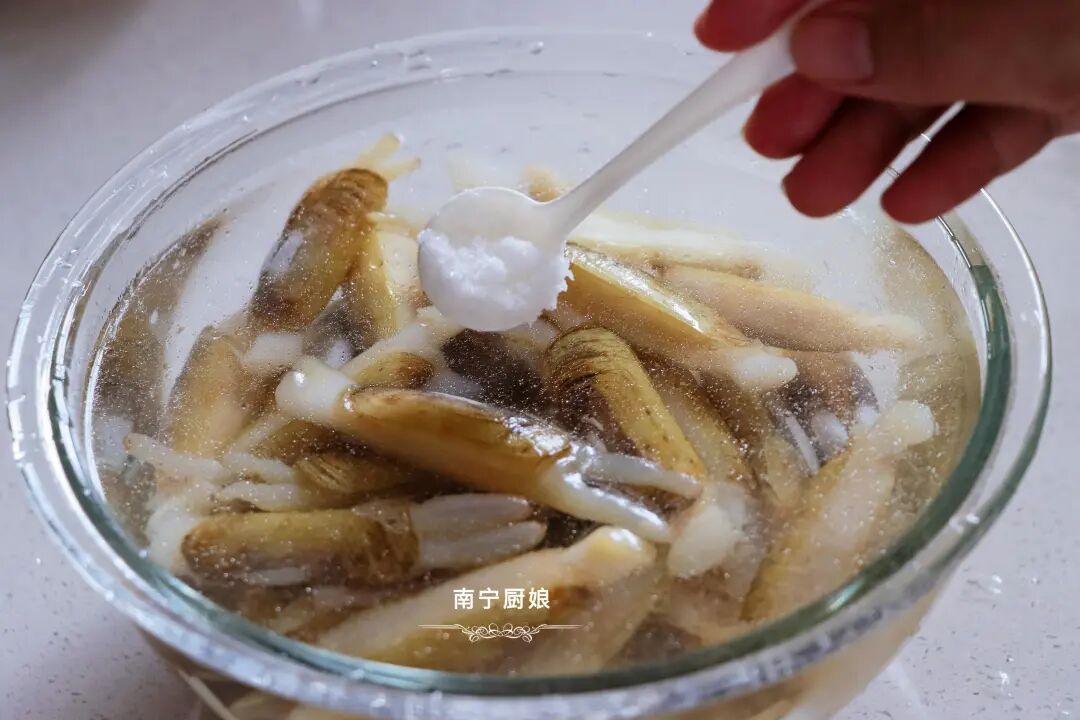 第一步,处理蛏子。刚买回来的新鲜蛏子肯定是活的、含沙的,所以要把它们处理干净。我们把买回来的蛏子装入大碗中,然后加入没过蛏子的清水,往里面倒入适量的食用盐,均匀搅拌成一盆盐水,等两个小时,直到蛏子吐完沙。