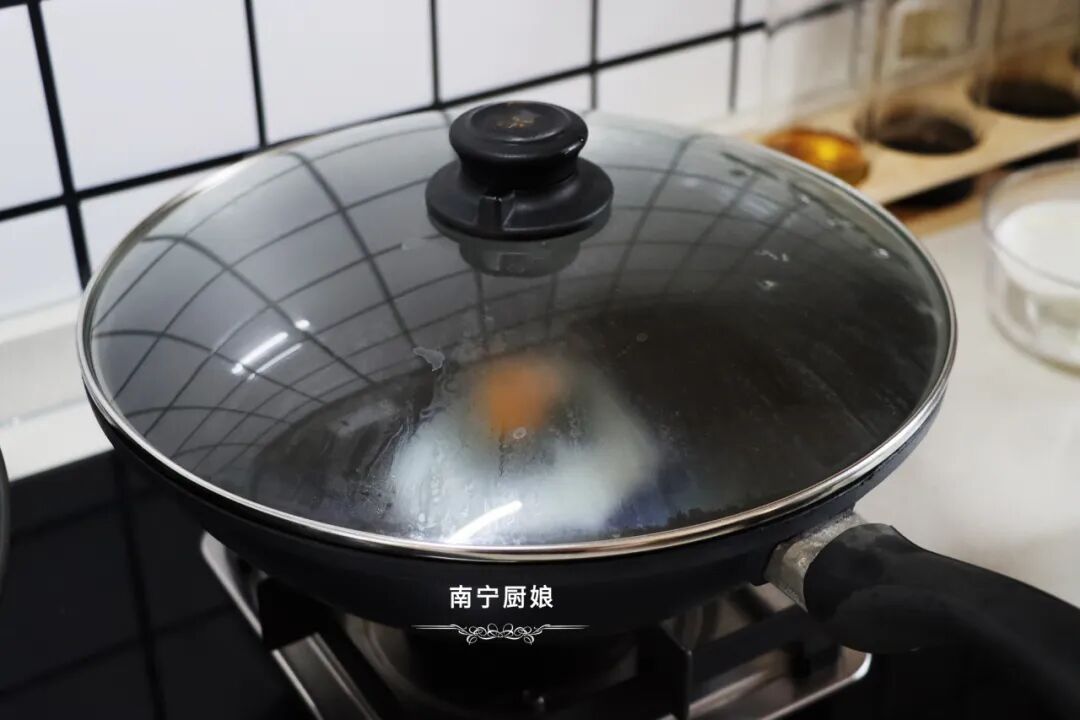 随后盖上盖子焖几分钟,让蛋液凝固,这样再烹煮就不会松散了。