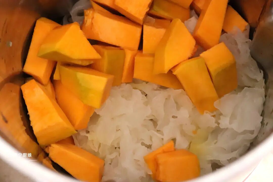 单独拿南瓜来做特饮好像显得有点单调,于是我又加入了半朵银耳来增加粘稠度的同时又可以增加口感层次。在功效上,南瓜本身就具有清热解毒祛湿的功效,我再加上银耳一起,会起到润肺养胃的作用。