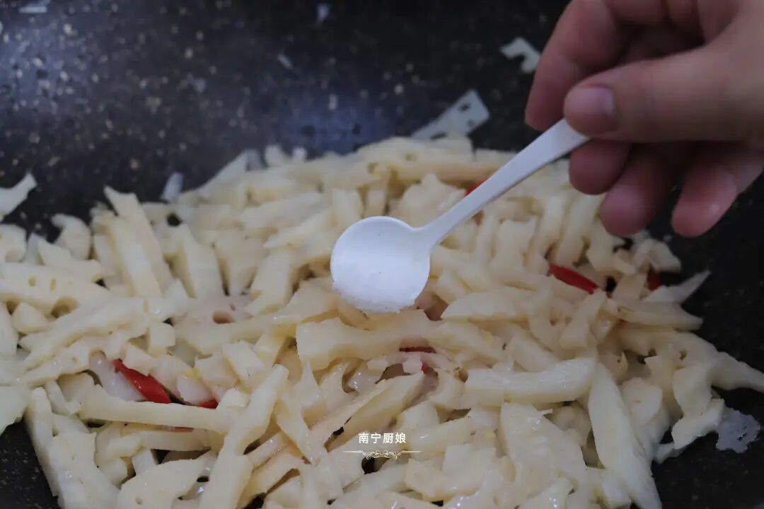 6、放入半勺鸡精和半勺食盐调味,翻炒均匀即可出锅。