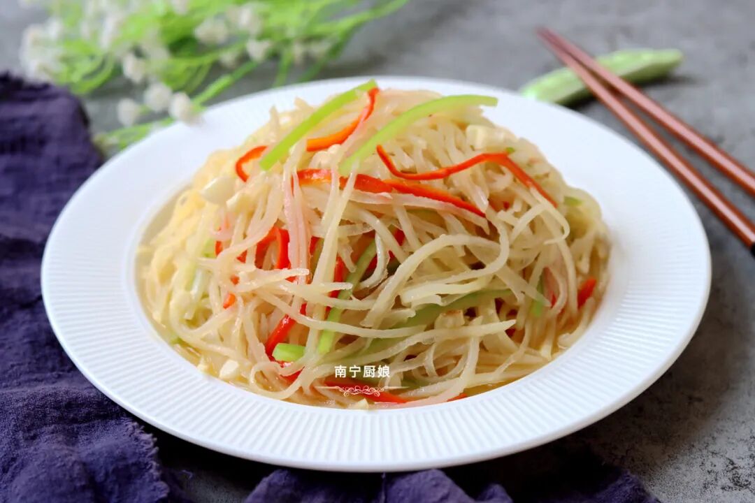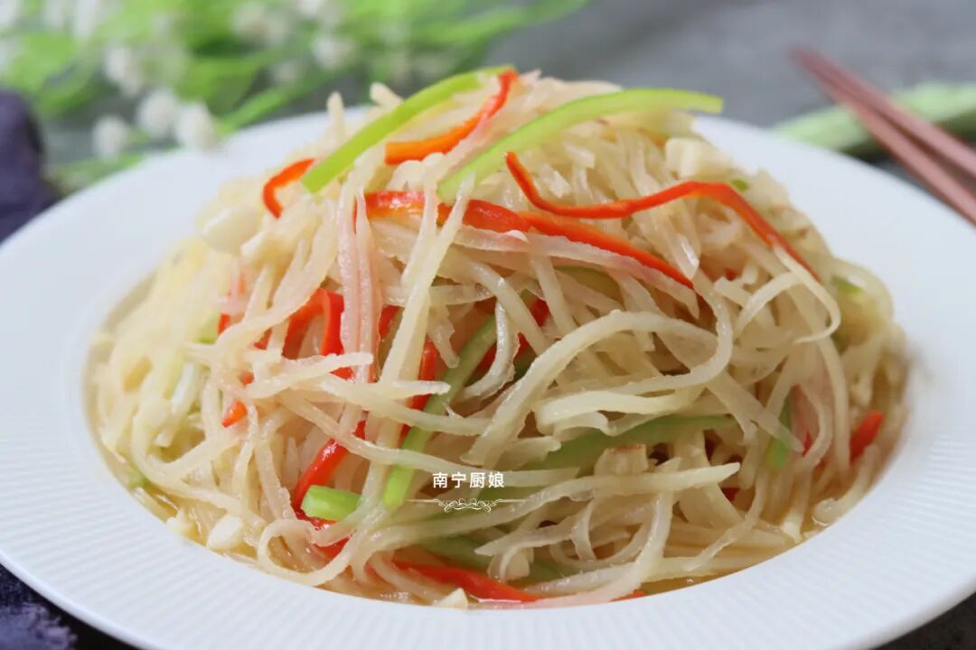 同时可以去除掉土豆丝中的淀粉,避免土豆丝粘锅,也可以让土豆丝吃起来更加清脆。