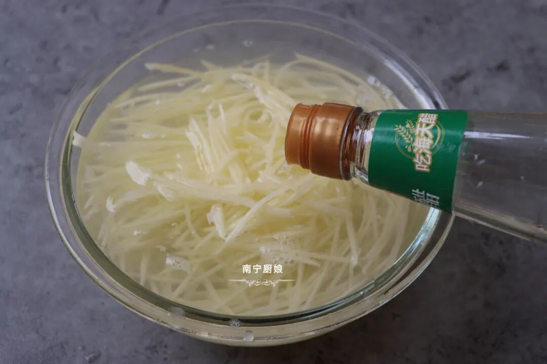 还可以往水里加入一点白醋,白醋可以防止土豆丝变黑,同时提前让土豆丝入味。