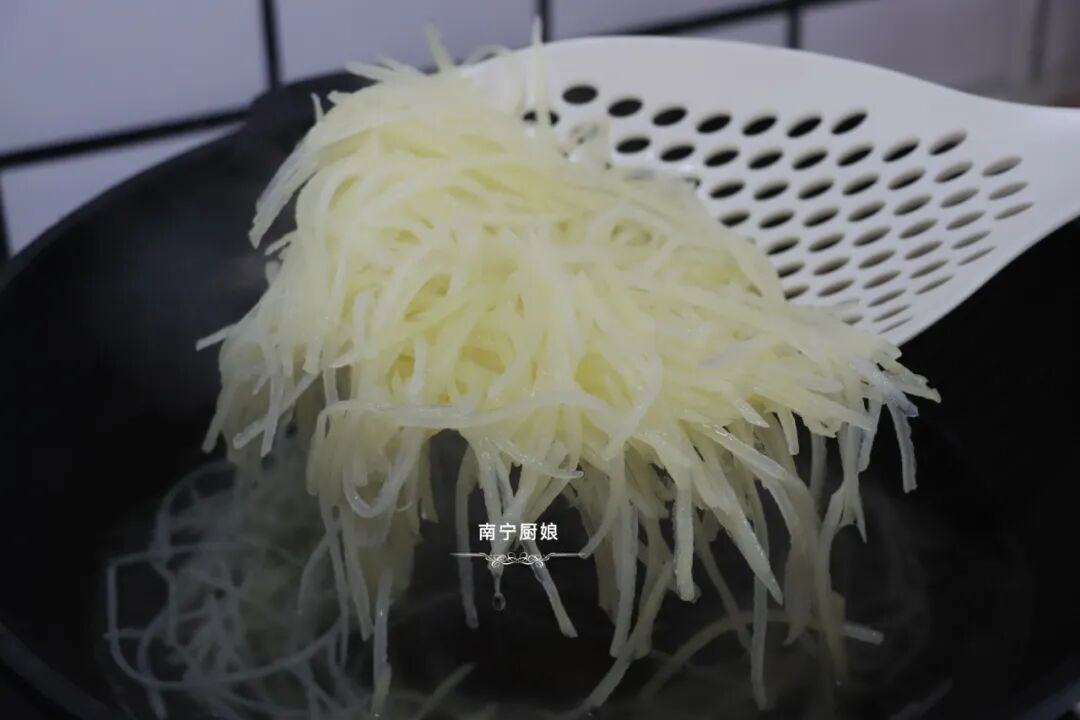但千万不要焯水太长时间,一般30秒就可以捞出来,并且一定要等水开之后再下土豆丝,这样才可以缩短土豆丝焯水的时间。
