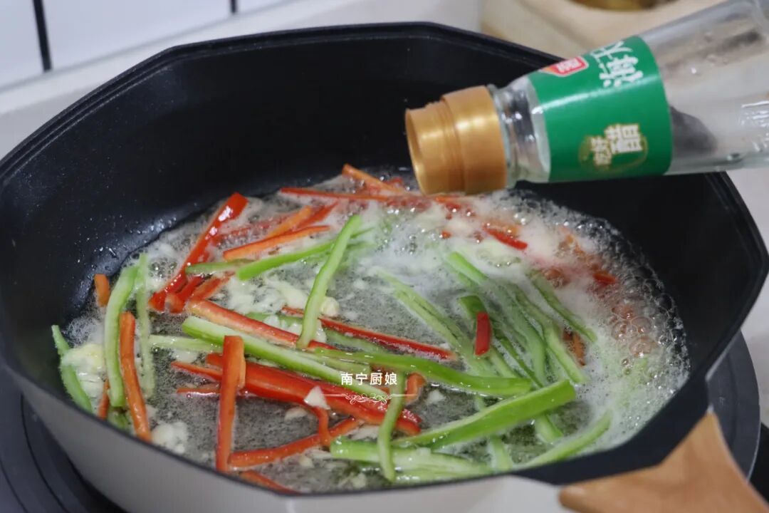 但在这些配料爆香之后,要先在锅内加入少许的白醋,白醋可以让土豆丝保持长时间的清脆口感。