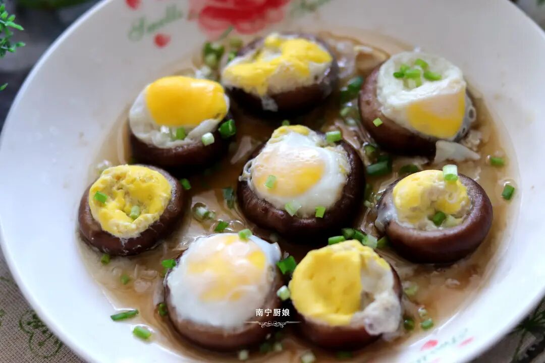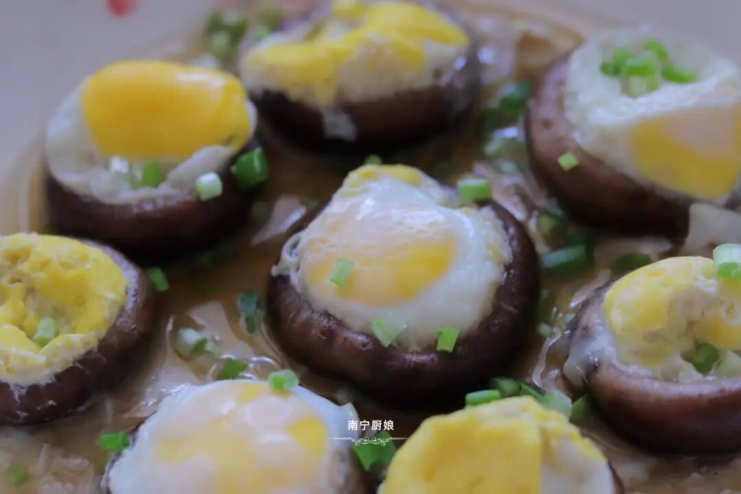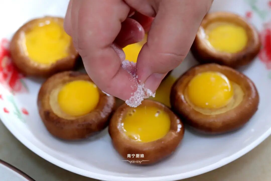 3、在每个香菇里都打上一个鹌鹑蛋。