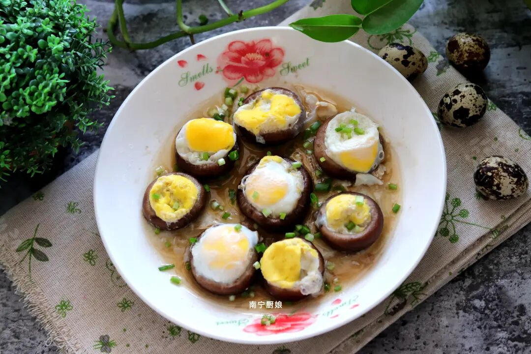 香菇味道鲜美,香气沁人,营养丰富。香菇富含维生素B群、铁、钾、维生素D原,具有提高免疫力、延缓衰老、抗癌、降低胆固醇的作用,而鹌鹑蛋的营养价值一点也不亚于鸡蛋,富含蛋白质、钙质、赖氨酸、维生素等微量元素,具有美容护肤、补虚健体的功效。