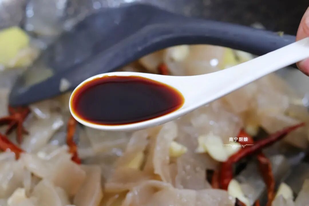 4、放入1勺老抽、2勺生抽调味,翻炒均匀。