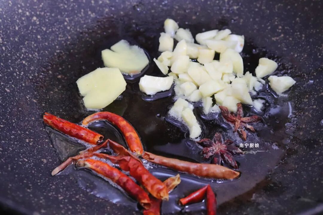 2、重新起锅,在锅里倒入适量的油小火烧热,把生姜片、干辣椒、八角、大蒜倒入锅中爆香。