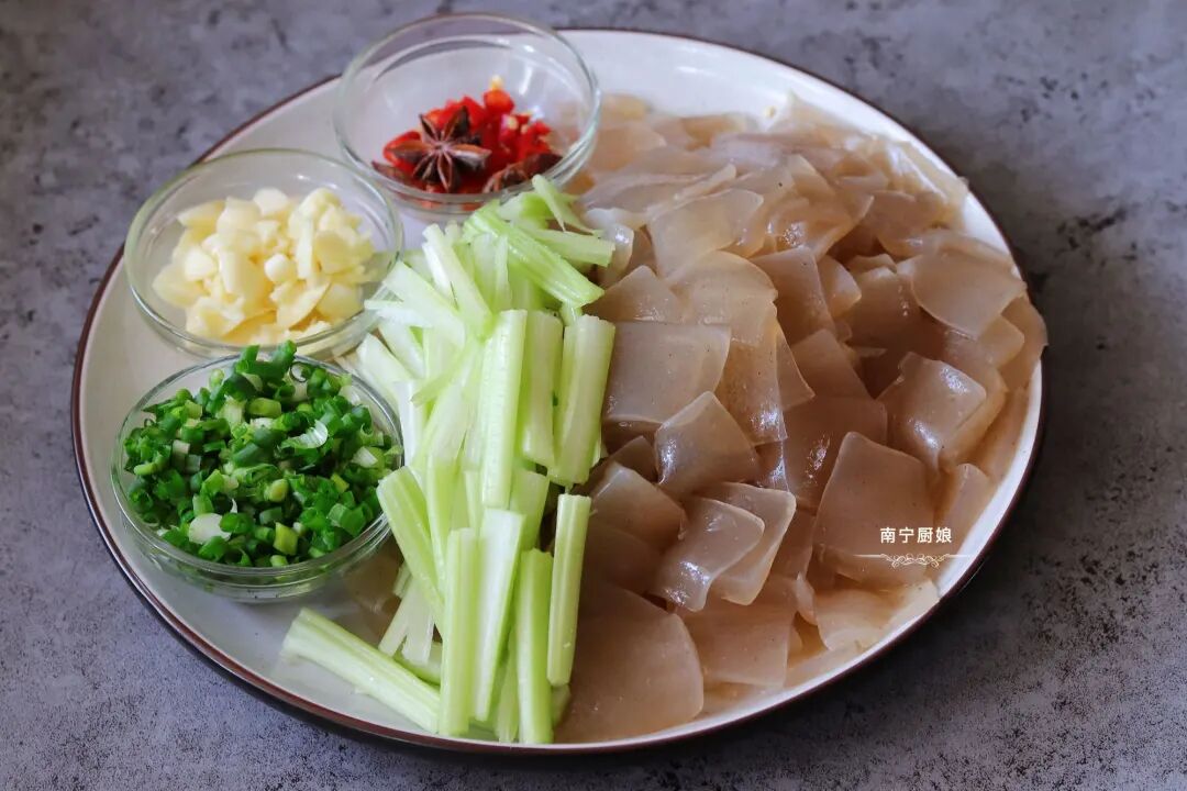 准备好食材:魔芋500克、芹菜2小根、大蒜3粒、香葱1颗、小红椒3颗、干红椒4颗、八角2颗、老抽1勺、生抽2勺、食盐1勺。