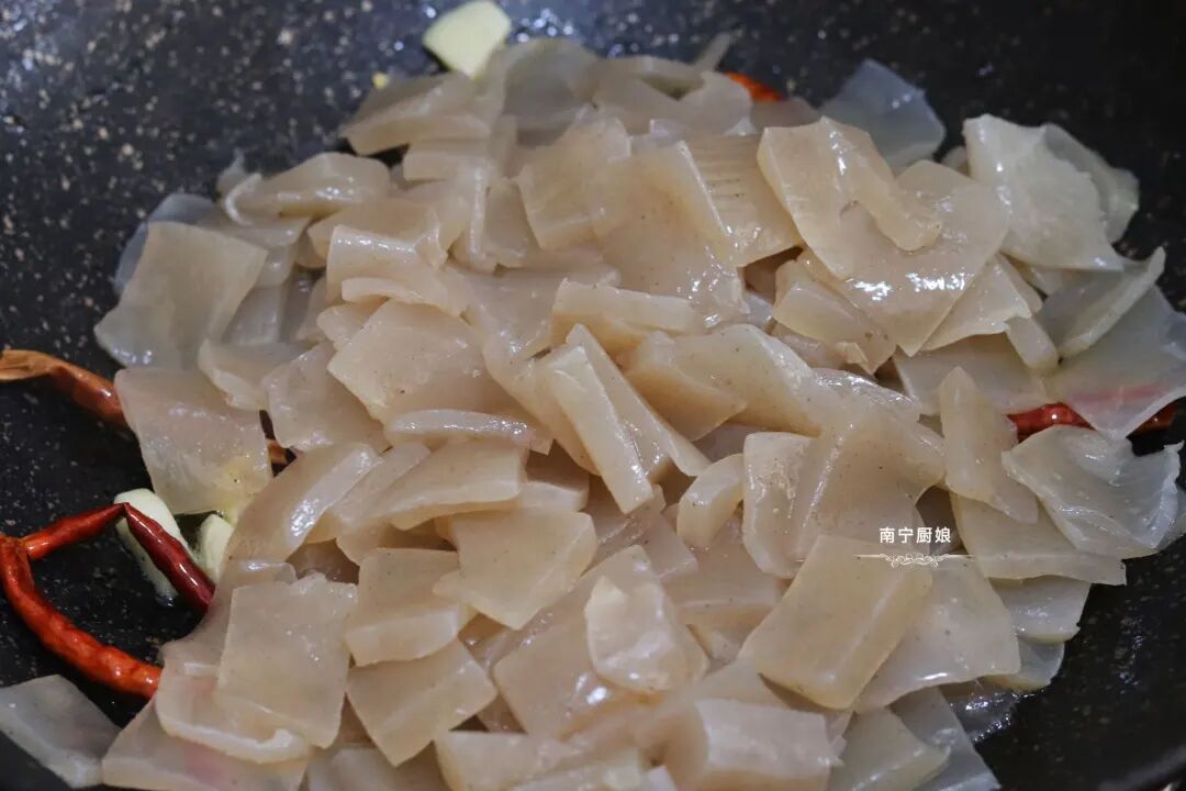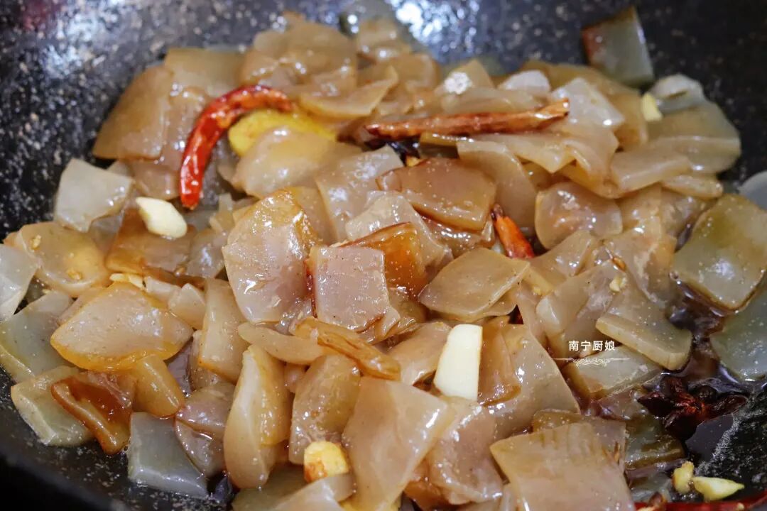5、把魔芋豆腐片翻炒均匀,让魔芋豆腐片都染上生抽老抽的颜色。