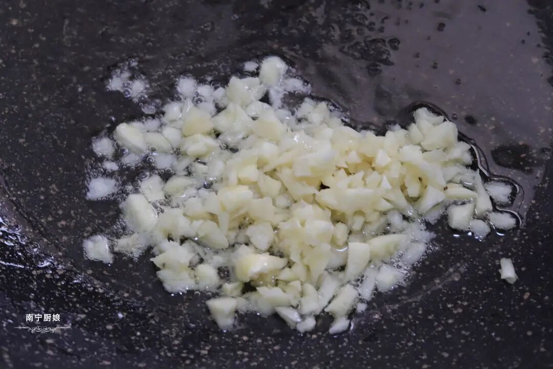 4、在锅里倒入适量的花生油,小火烧热,把蒜米倒进去爆香。