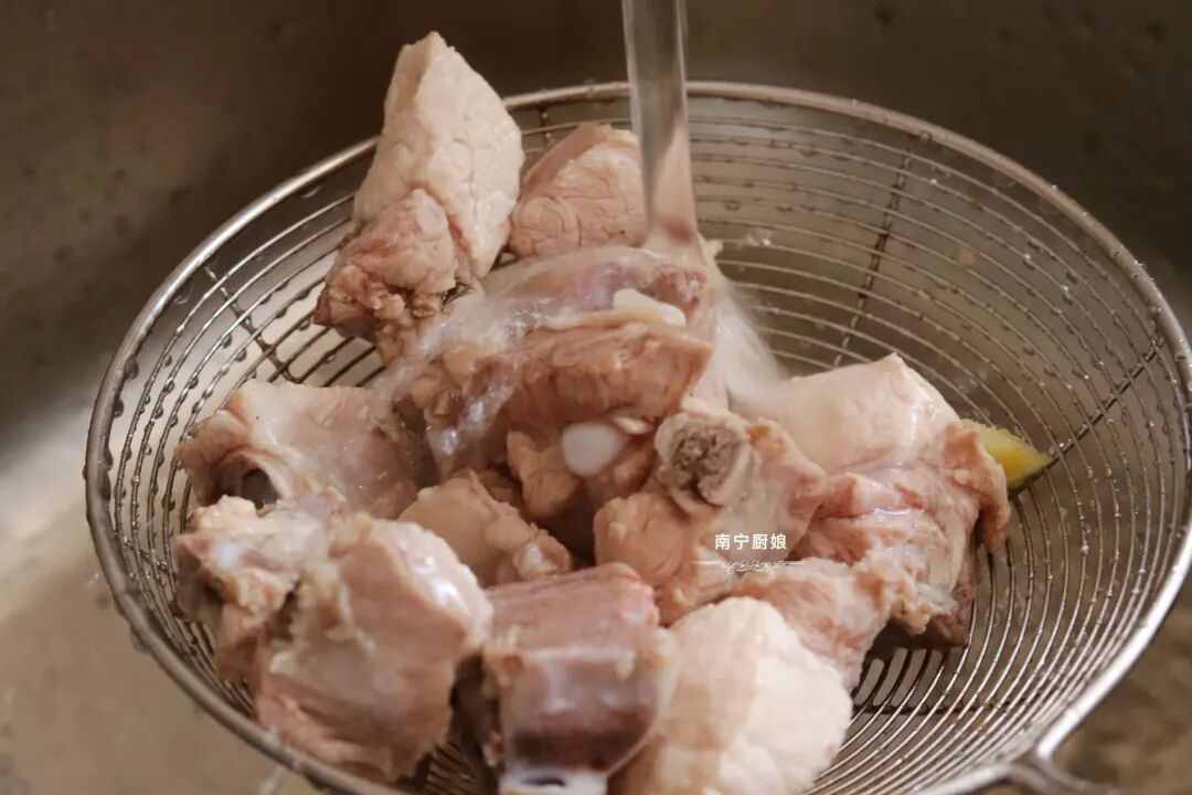 2、用滤网把排骨捞出来,放在水龙头下冲洗掉浮沫。