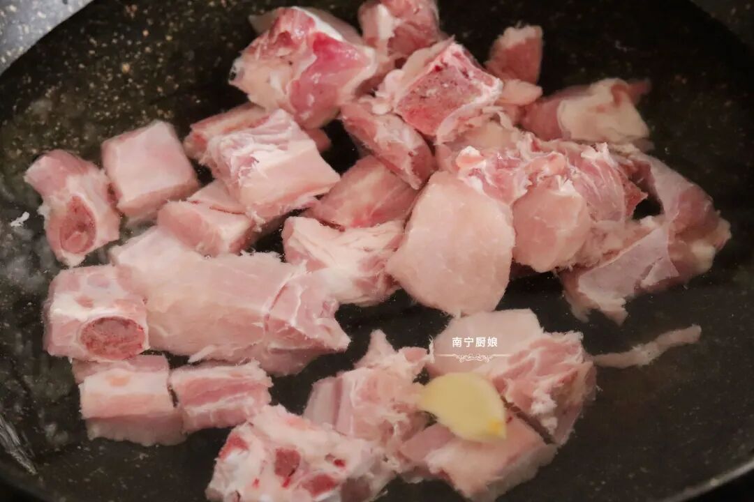 3、把排骨放入高压锅内胆中,再放入一片生姜。