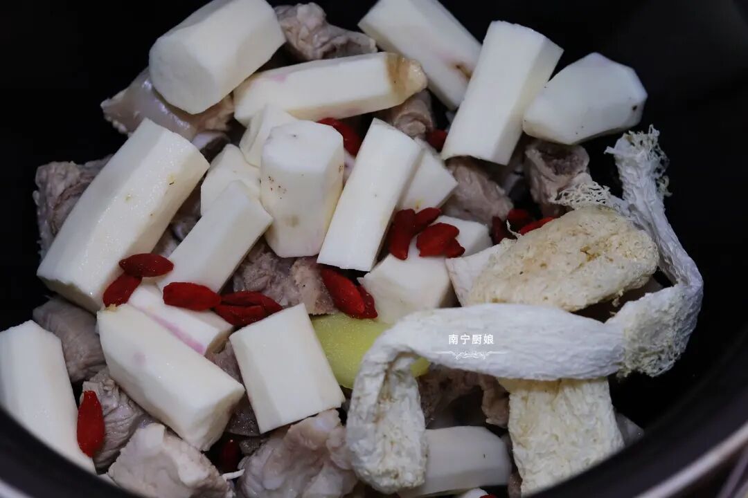 4、把枸杞、山药、竹荪也放入锅中。