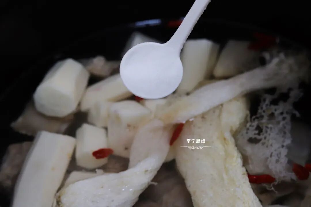 时间到了后,开盖再放入适量的食盐调味,一道鲜美滋补的竹荪山药排骨汤就做好啦!出锅装碗,上桌。