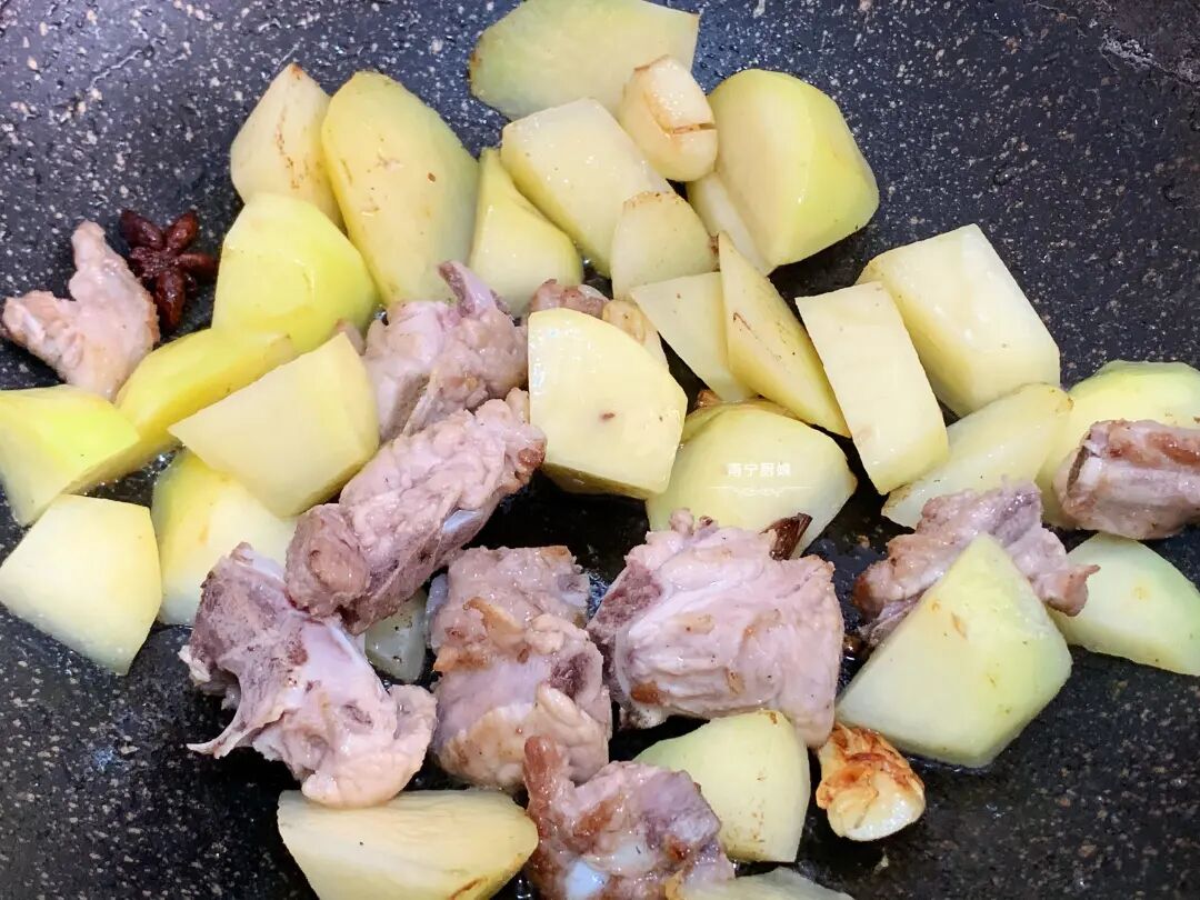 5、土豆和排骨炸好后,加水焖煮的水不要放太多,要不然最后烧出来会很多汤汁,要用生粉水来勾芡才行。