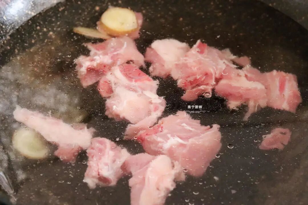 1、起锅,在锅里倒入半锅凉水,把排骨在水龙头冲洗一次后放入锅中,放入2片生姜,开大火烧热焯水。