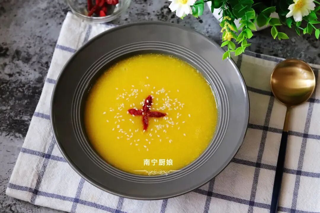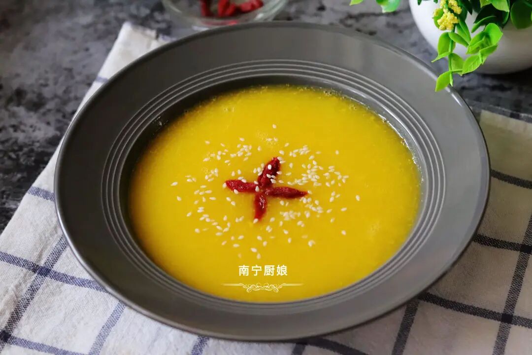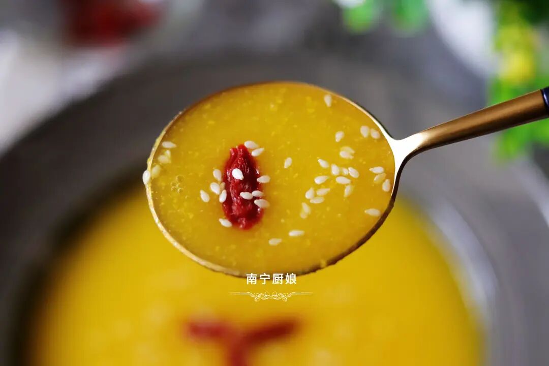 打成糊后,倒进碗里或者杯子里,再放入即可枸杞和撒入些许熟白芝麻点缀下,一碗香浓爽滑的南瓜玉米糊就做好啦!