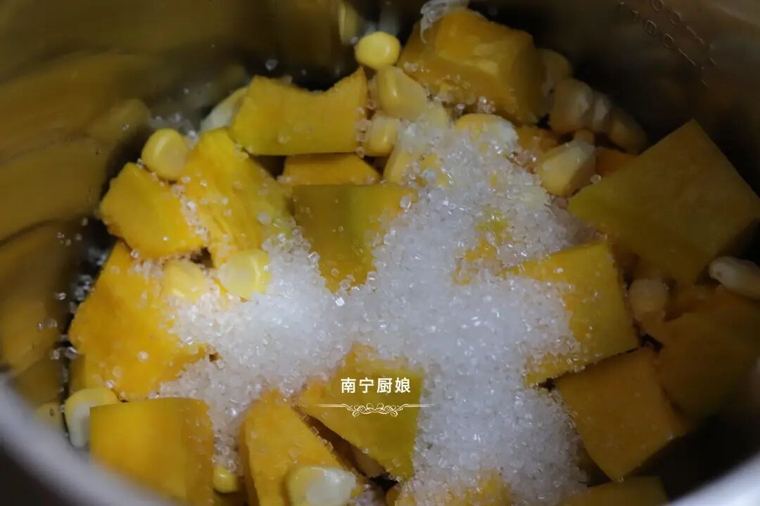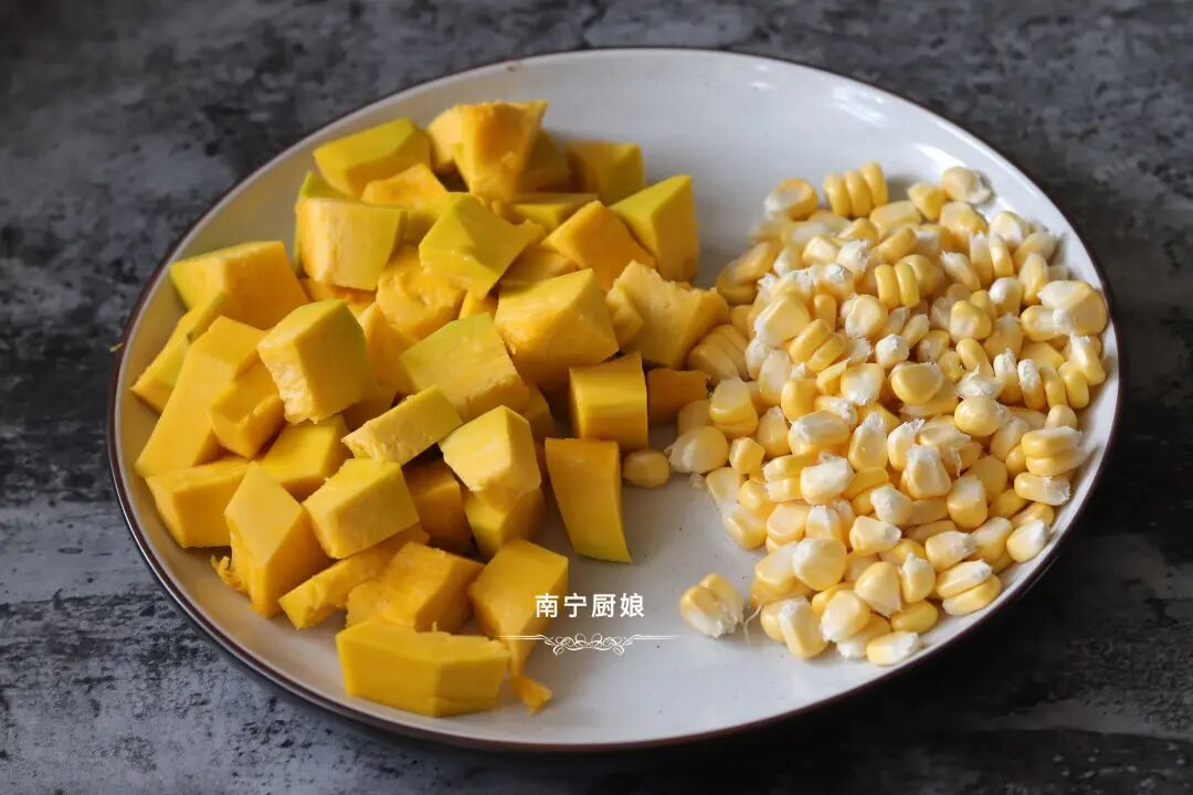 准备好食材:南瓜半个去皮后切成小方块、玉米1根洗净后剥成粒,白砂糖1勺。