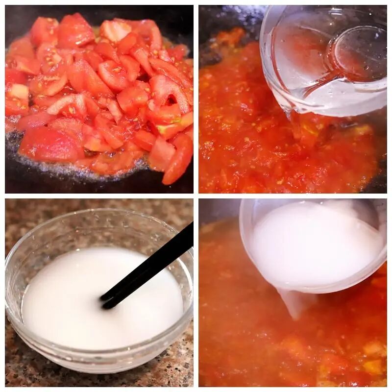 3、锅中加油,开小火烧热油后将西红柿块倒进锅中,煸炒至出沙,放盐调味。放入适量清水,可根据食用量来放。等待锅中的汤汁煮沸,与此同时,勾芡一碗水淀粉。汤汁煮开时将水淀粉淋进去。