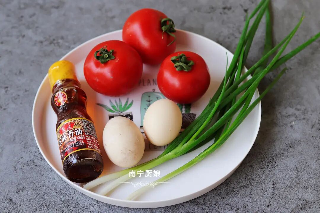 准备食材:西红柿3个、鸡蛋2颗、一棵小葱,食盐适量,一碗水淀粉,油和香油。