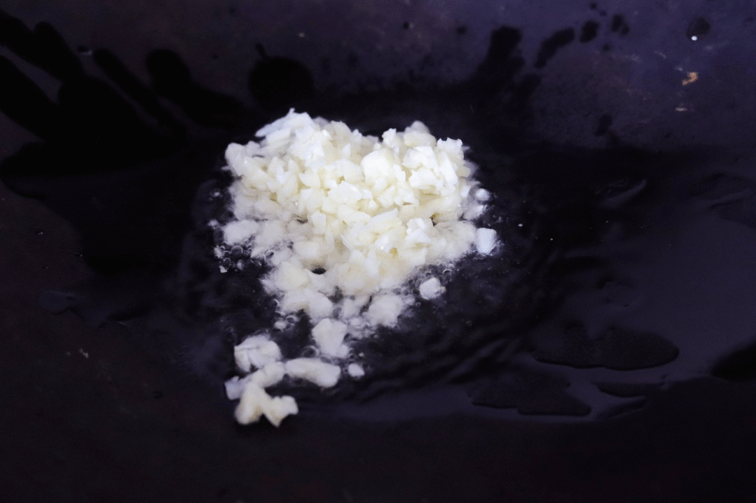 2、锅中倒入适量油,开火烧热后,倒入蒜末爆香,先倒入豆角翻炒,翻炒至豆角的颜色变深,再倒入没过豆角的清水焖煮10分钟。