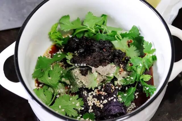 1、调配汁料。碗中放入切碎的香菜(喜欢吃香菜可多放),两克盐,一勺白胡椒粉,浇入十克生抽和十克耗油,最后淋上三克香醋。取出一勺老干妈,撒上一些熟白芝麻。