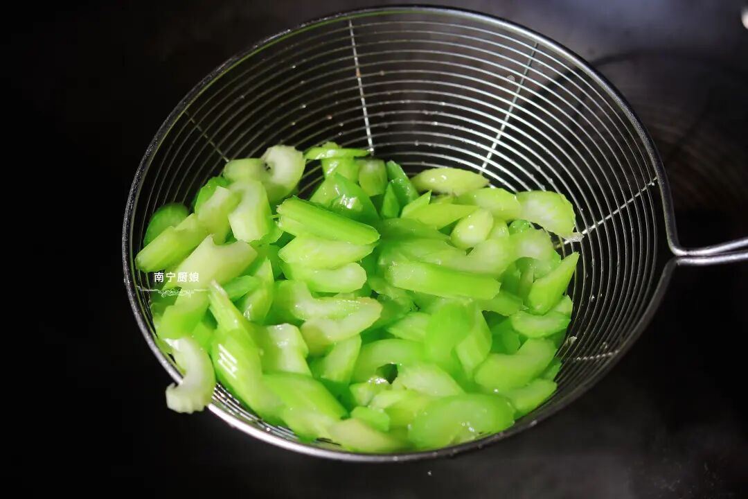 第三步:我们最好把芹菜都焯一下水,这样成菜的速度会更快一些,而且芹菜相比起百合来说更生硬难熟,百合是很娇嫩的,芹菜不焯水炒的时间就会需要很长,那么百合就蔫了,很影响口感。等到芹菜焯完水之后,放在一旁沥干留着备用。
