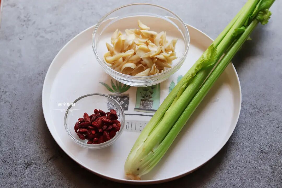 准备材料:西芹1根、百合20克、枸杞5克、食用油、白糖、食用盐各一小匙。