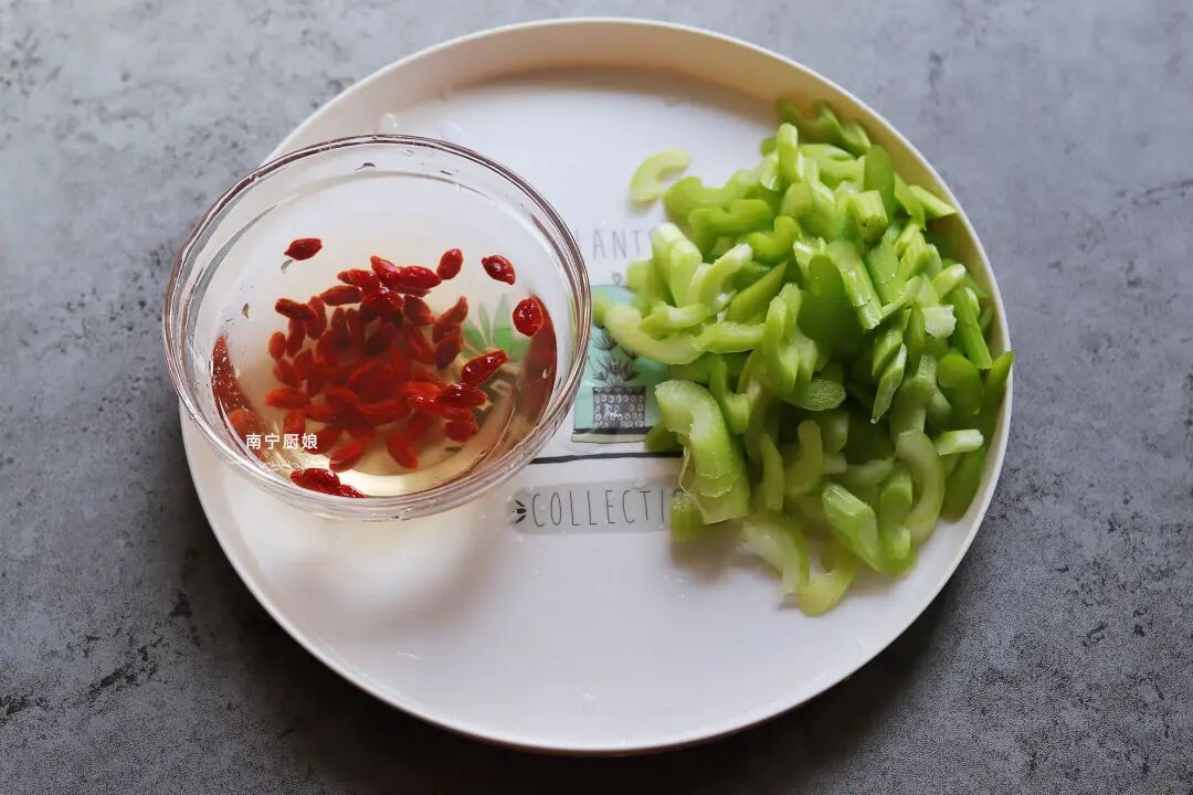 第一步:把西芹去除干净它的皮、叶子和老筋。这一步千万不能省,因为炒出来的西芹口感好不好吃就要看这一步你择菜择得干不干净了,还有皮和老筋残余吃起来会有些渣渣的,不好吃。去除干净清洗完之后将西芹斜着切成菱形小段装盘待用。枸杞放入凉开水泡发。