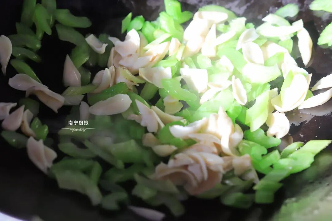 第四步:放油热锅,当锅热了之后就可以放芹菜进去炒了。当芹菜炒至五分熟的时候我们再把百合、盐和糖放进去,最后把泡发好的枸杞也放进去稍稍翻炒一下就可以出锅了。需要特别注意的一点是,千万不要炒得太久,不然不管是百合还是芹菜都会变得很老,口感就没有那么好了。