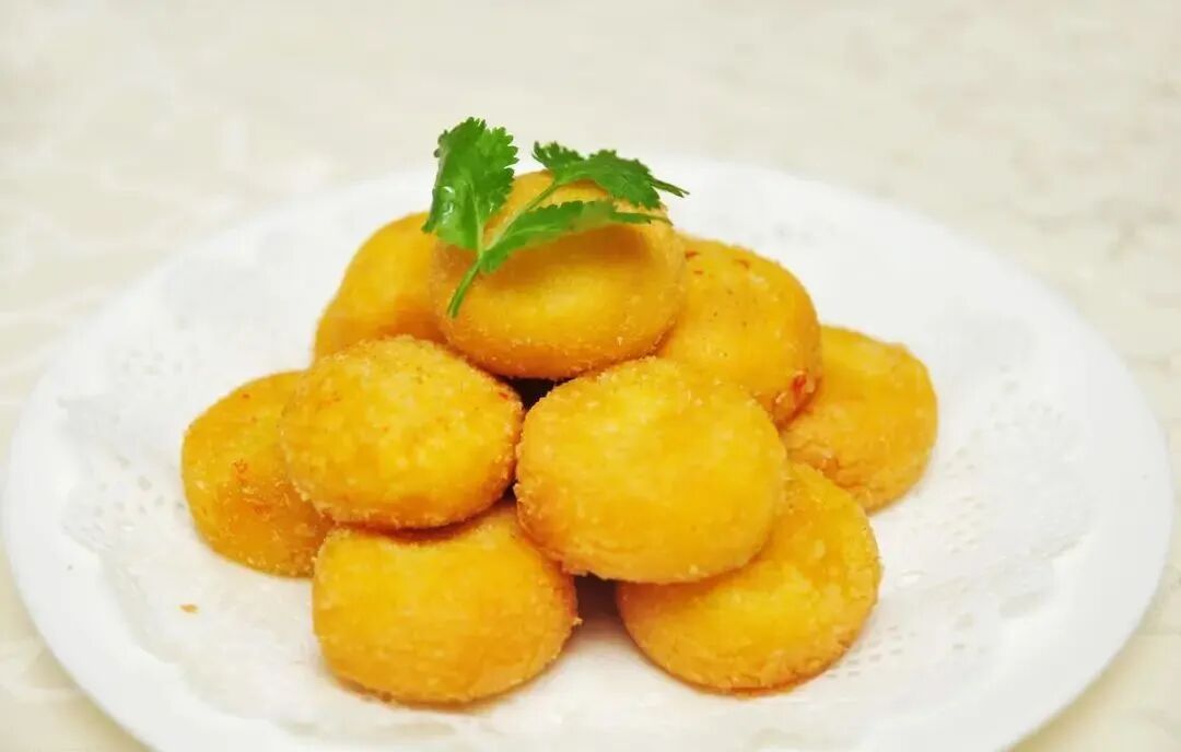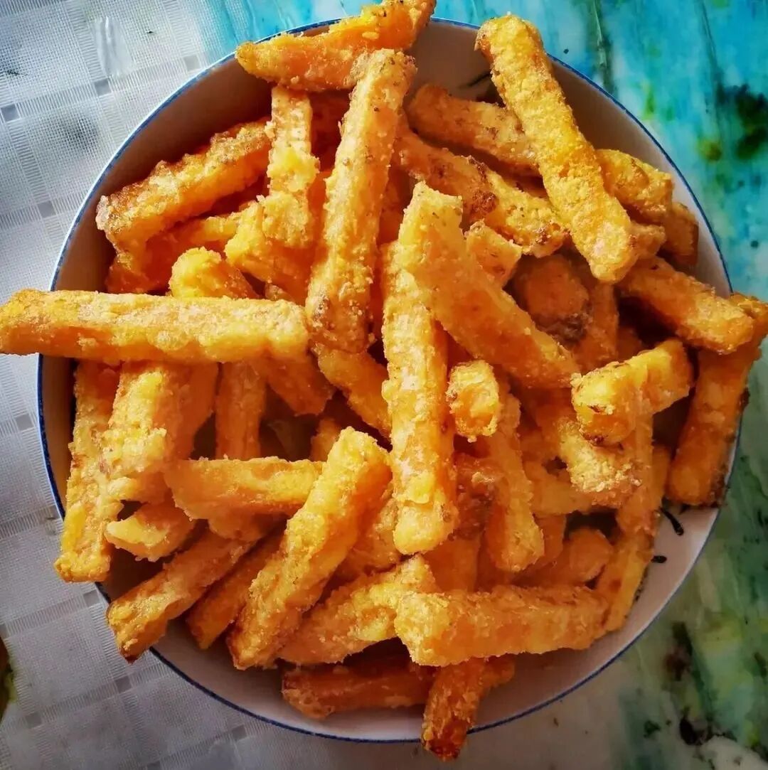 第四步:将红薯放在锅中炸至外皮酥脆后捞出,在锅中留少量的油,把捣碎的蛋黄放入锅中炒起沙后,将红薯倒入锅中和咸蛋黄一起炒均匀,便可出锅。