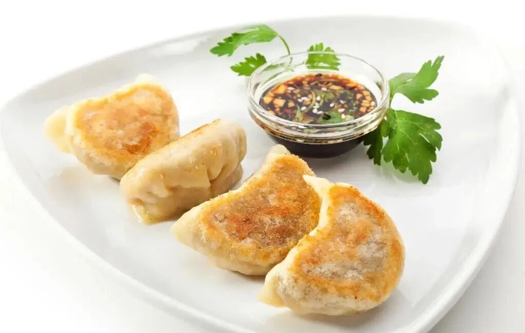 第三步:将包好的饺子放入锅中煎至饺子底部有焦壳的时候,将粉浆倒入锅中,随后盖上锅盖,粉浆烧干即可出锅。