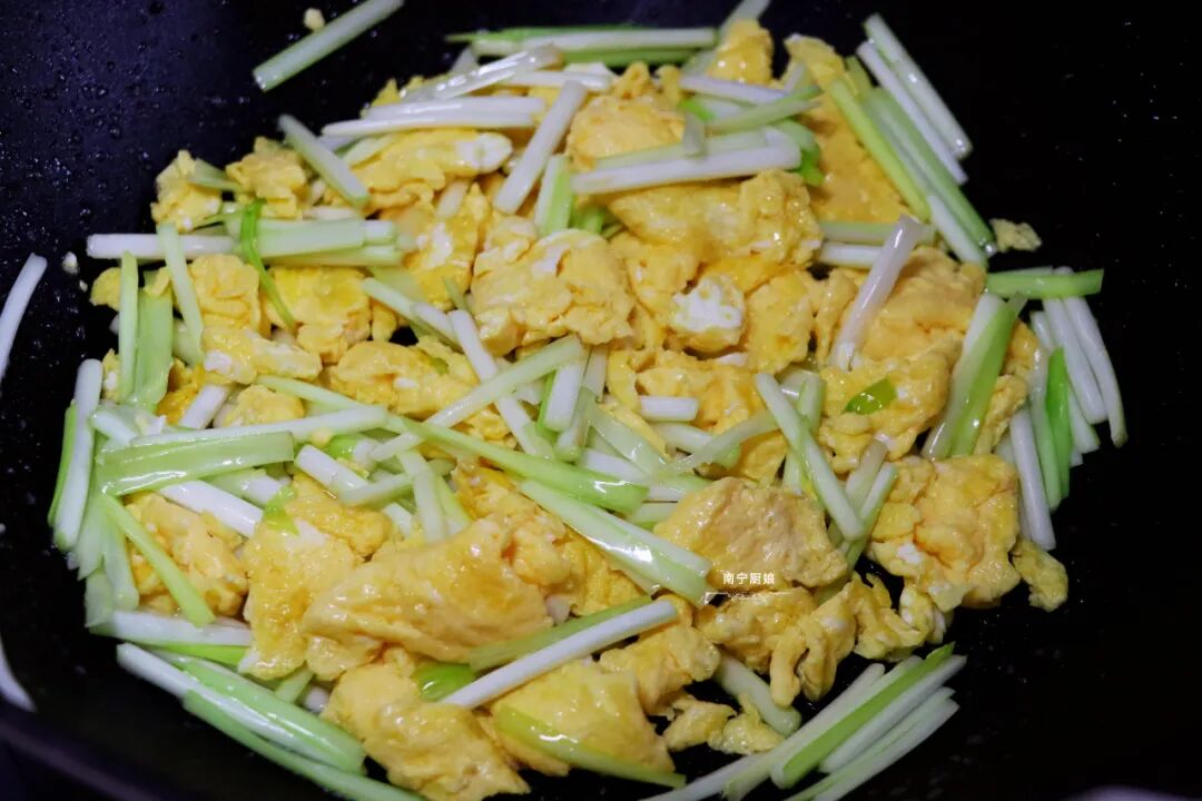 3、待鸡蛋煎到定型,就可以把切好的韭黄倒入锅中,一起清炒,很多朋友在炒韭黄炒蛋的时候,都习惯把韭黄和鸡蛋分开炒,但这么做的话就容易导致韭黄和鸡蛋的味道互相不融合,吃起来的口感也就偏差了,韭黄是一种比较容易熟透的蔬菜,因此是不需要分开炒的,鸡蛋炒到定型之后就可以直接倒入锅中一起炒了。