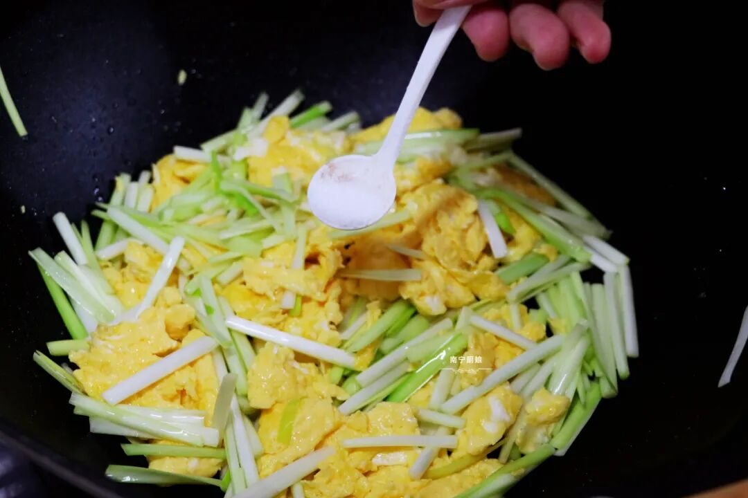4、韭黄下锅之后,还有关键的一步,就是要下入少量的食用盐,韭黄当中的水分是比较多的,在韭黄刚下锅的时候就加入食用盐,可以破坏韭黄当中的纤维,让韭黄更快的释放出水分,那么韭黄的口感就可以保持香脆,同时也可以更快的熟透了。
