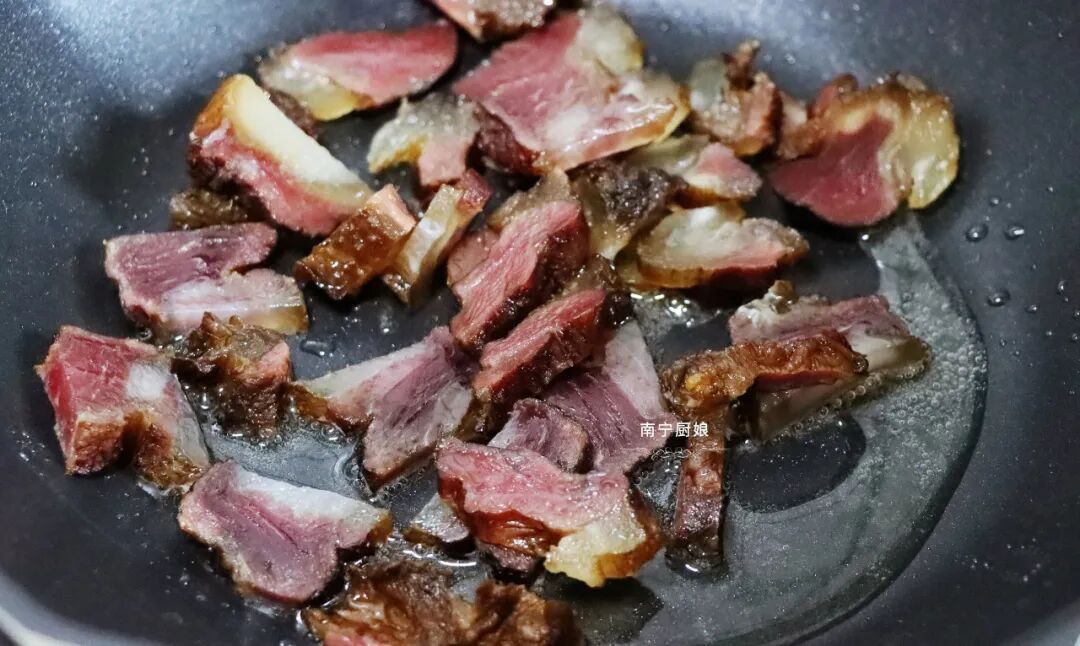 4、起锅往锅里加入少量的食用油,然后就可以把切好的腊肉放进锅里,文火慢煎,煎出腊肉当中多余的油脂以及腊肉的香味。很多朋友在处理腊肉的时候都少了这么一个步骤,所以腊肉煎出来的味道就不够鲜香,同时吃起来还会比较油腻,我们把腊肉先煎过一遍之后,吃起来的口感就会更焦香了。