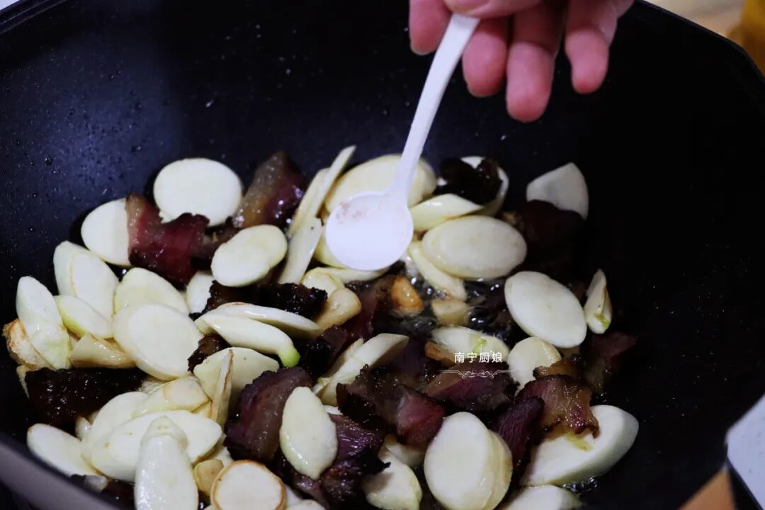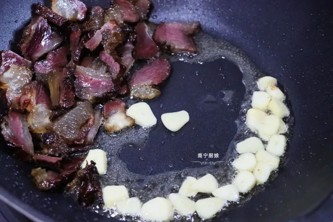 5、等腊肉都煎出香味之后就可以把腊肉剥到锅边,然后再加入切好的蒜片,爆炒出香味。