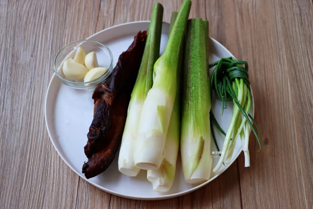 准备食材:茭白4根,烟熏腊肉250克,葱段适量,蒜米适量。
