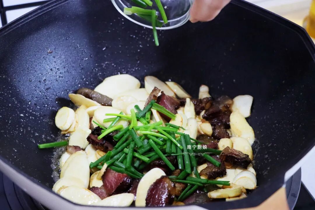 8、加入食盐之后快速翻炒,把茭白和腊肉炒出香味之后,就可以加入少量的蚝油以及生抽翻炒出香味之后再最后加入切好的葱段就可以出锅啦。