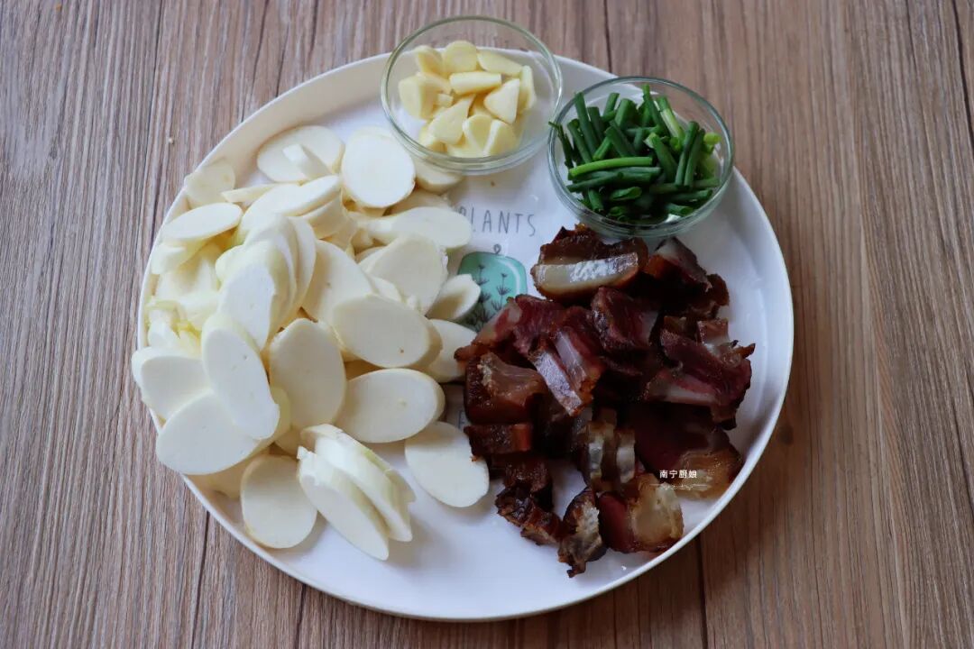 3、茭白和腊肉都处理好之后,就可以把茭白以及烟熏腊肉切成片状。然后再把葱段切成葱花,蒜米切成蒜片,放在一旁一起备用。