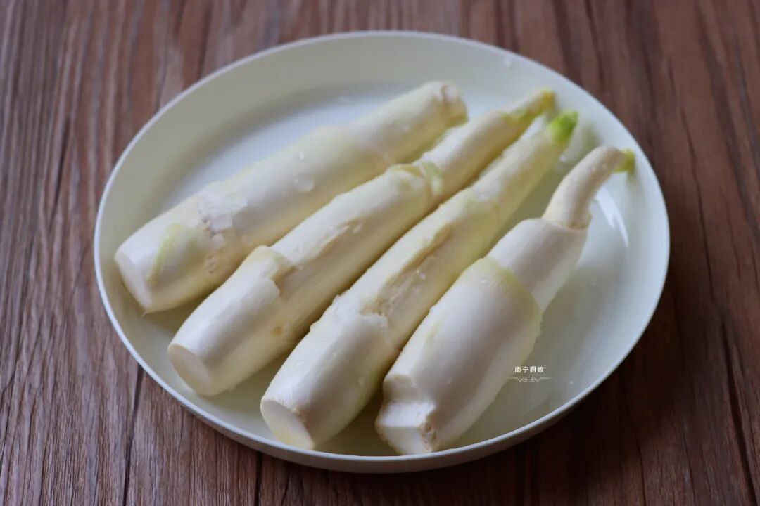 2、烟熏腊肉在炖煮的过程中,可以一起清洗茭白。在处理茭白的时候,我们不但要把茭白清洗干净,同时还要把茭白外部绿色的一层外皮给摘掉,只保留茭白内部白色比较鲜嫩的部分,这样的茭白吃起来口感才会更好,更脆嫩。