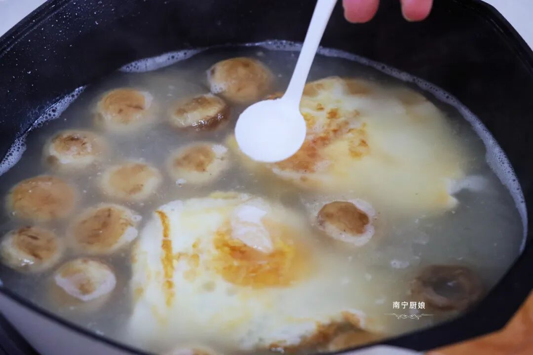 6、开水入锅之后,等锅里的汤汁再一次沸腾,就可以加入适量的食用调味,口蘑和鸡蛋都是很鲜香的食材,因此不需要加入太多调味料,只需要一点食盐就可以激发出食材最鲜美的味道啦。
