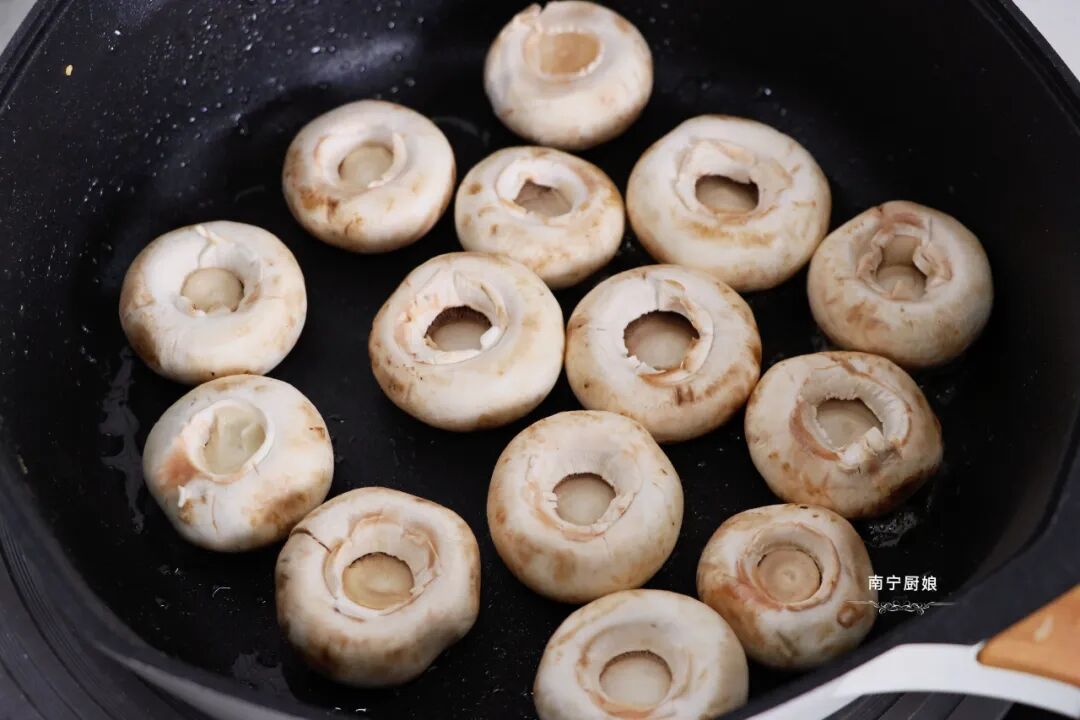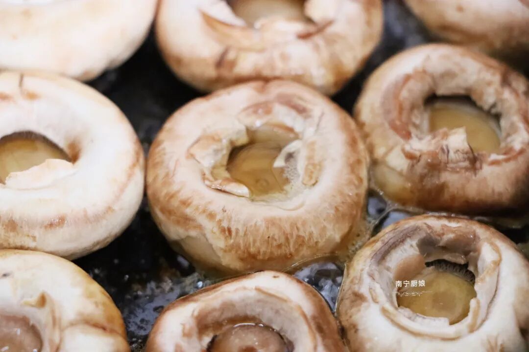3、文火慢煎,把口蘑当中的水分煎出来,几分钟之后大家就可能看到口蘑就像一个个小碗,在菌帽里都积攒了不少水分,这些水分就是口蘑的精华所在了,最鲜美的味道都融入在了一个个菌帽里。