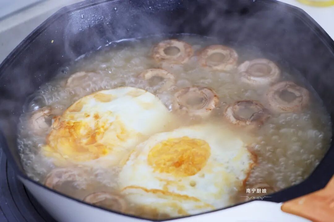 5、接下来就可以继续往锅里加入开水,鸡蛋当中蛋白质丰富,加入开水就可以更快的让鸡蛋当中的蛋白质稀释到锅里,那么汤汁也会因此而变白啦!