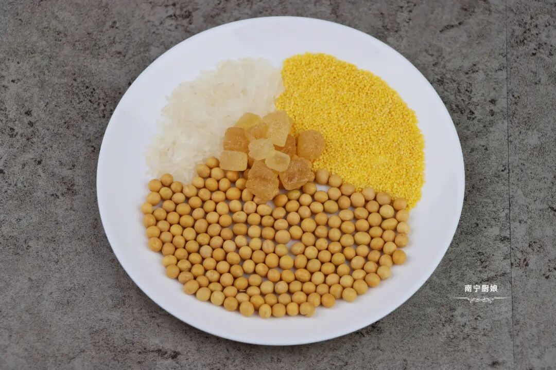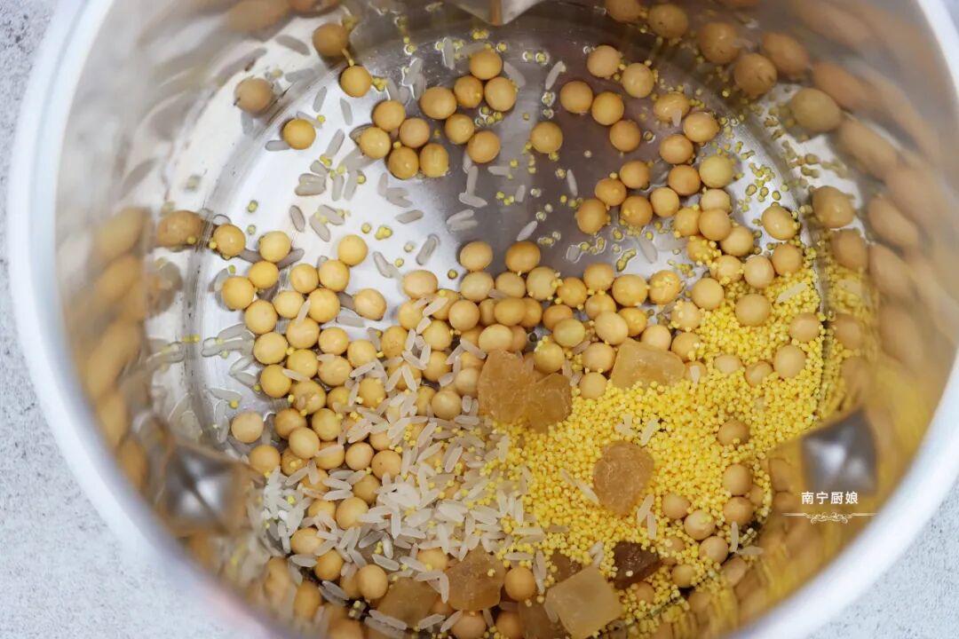 准备食材:大米10克,小米10克,黄豆45克,黄冰糖适量。