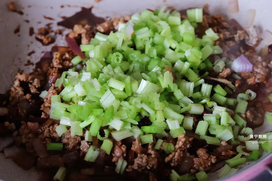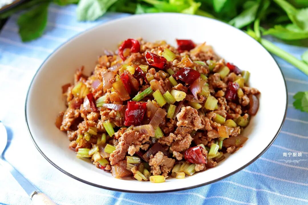 准备食材:芹菜丁 200克,牛肉沫200克,干辣椒20克,洋葱丁150克。