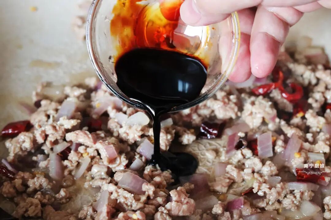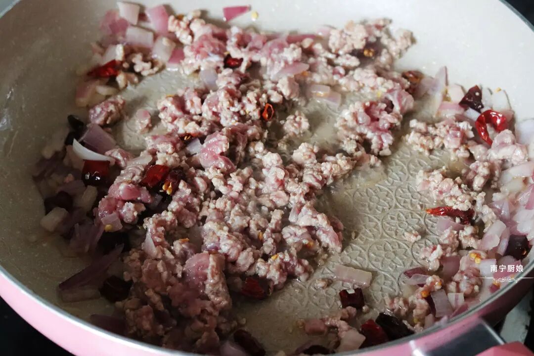 2、等洋葱丁和干辣椒炒出香味之后,就可以加入牛肉沫,快速翻炒,直到牛肉变色。
