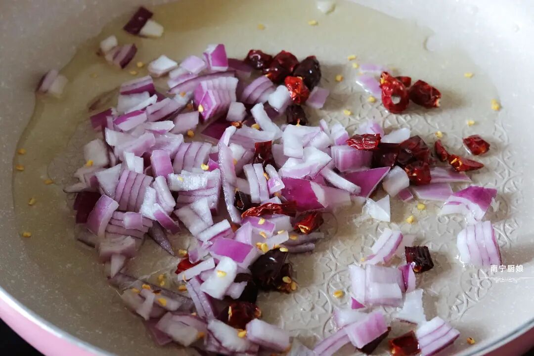 1、起锅,下入多一些的食用油,然后等油温升高之后,加入干辣椒以及洋葱丁,洋葱本身的香味就足够浓郁了,所以不需要再加入葱姜蒜去腥增香了哦。