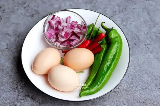 3个鸡蛋,5颗指天椒(我家没有剁椒酱,所以用指天椒剁碎来代替)、2颗青椒,一克糖,十五毫升植物油,适量盐,十五克洋葱。