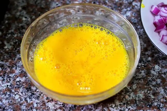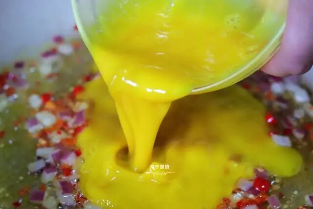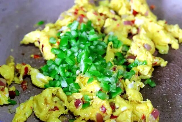 3、洋葱和剁椒酱翻炒之后,蛋液放入锅中,翻炒后放入一颗切好的青椒。